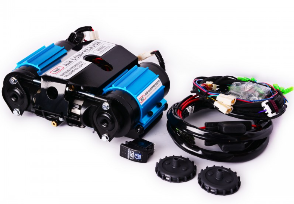 Dvojpiestový HF kompresor (12v) ekvivalentný CKTMA12 na napájanie HF pneumatických zámkov, ARB a iných zariadení ako aj na hustenie kolies. Vysokovýkonné zariadenie, ktoré dokáže obsluhovať niekoľko zariadení súčasne.
