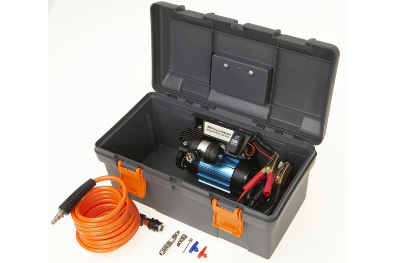 Prenosný kompresor ARB uzavretý v škatuli s rukoväťou.